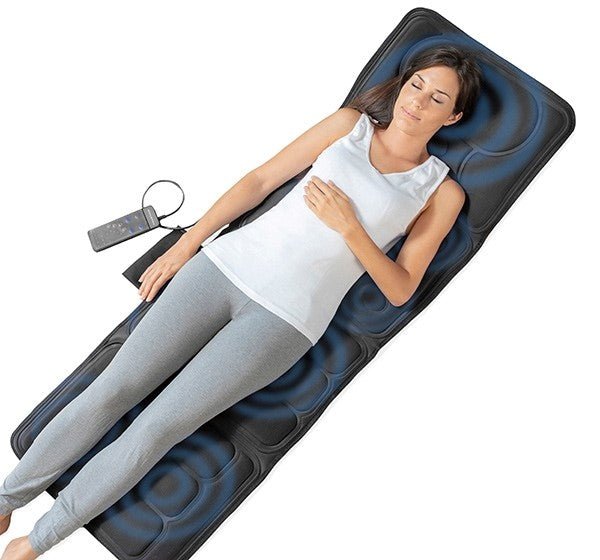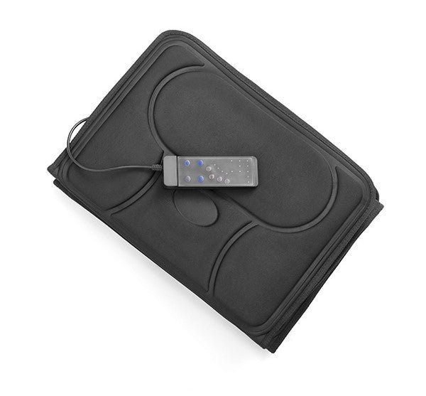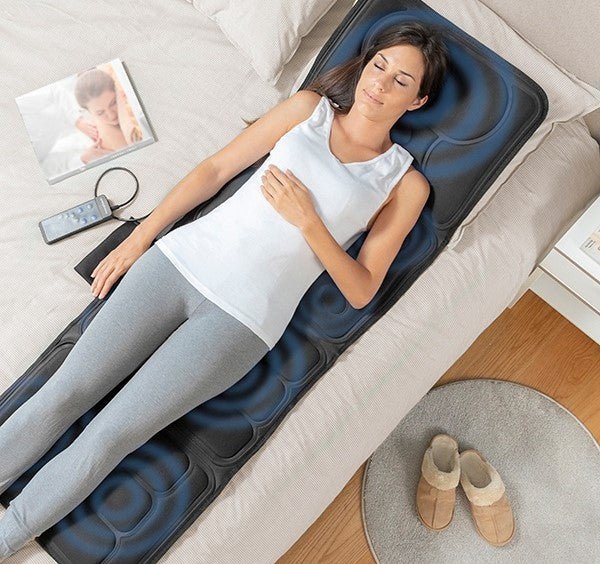 A comfortable electric massage mat with a well-padded soft weave which. thanks to its 10 motors. is very effective for enjoying complete relaxation on all parts of the body. The vibrating massage provides a pleasant sensation of relaxation and well-being. It can be used sitting or lying down and it has a heat function with remote control and pocket for the remote. It works by being plugged into the mains electricity (includes adaptor).