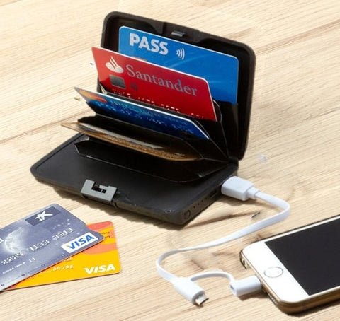 With this useful cardholder. your cards will be kept organized and safe from electronic theft thanks to their protective metallic alloy. What’s more. the fact it’s a portable external battery means you can charge your mobile phone anywhere without needing to plug it in! You can take it with you anywhere!